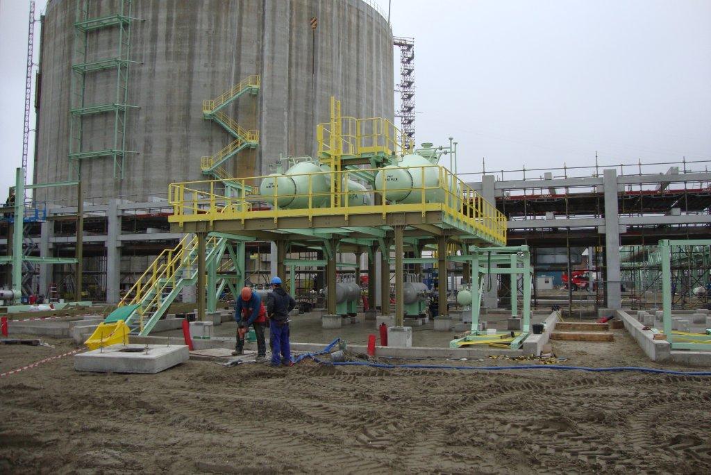 Delivery and construction of a pipe rack and various supporting structures and stairs, including a platform next to/ attached to a tank.