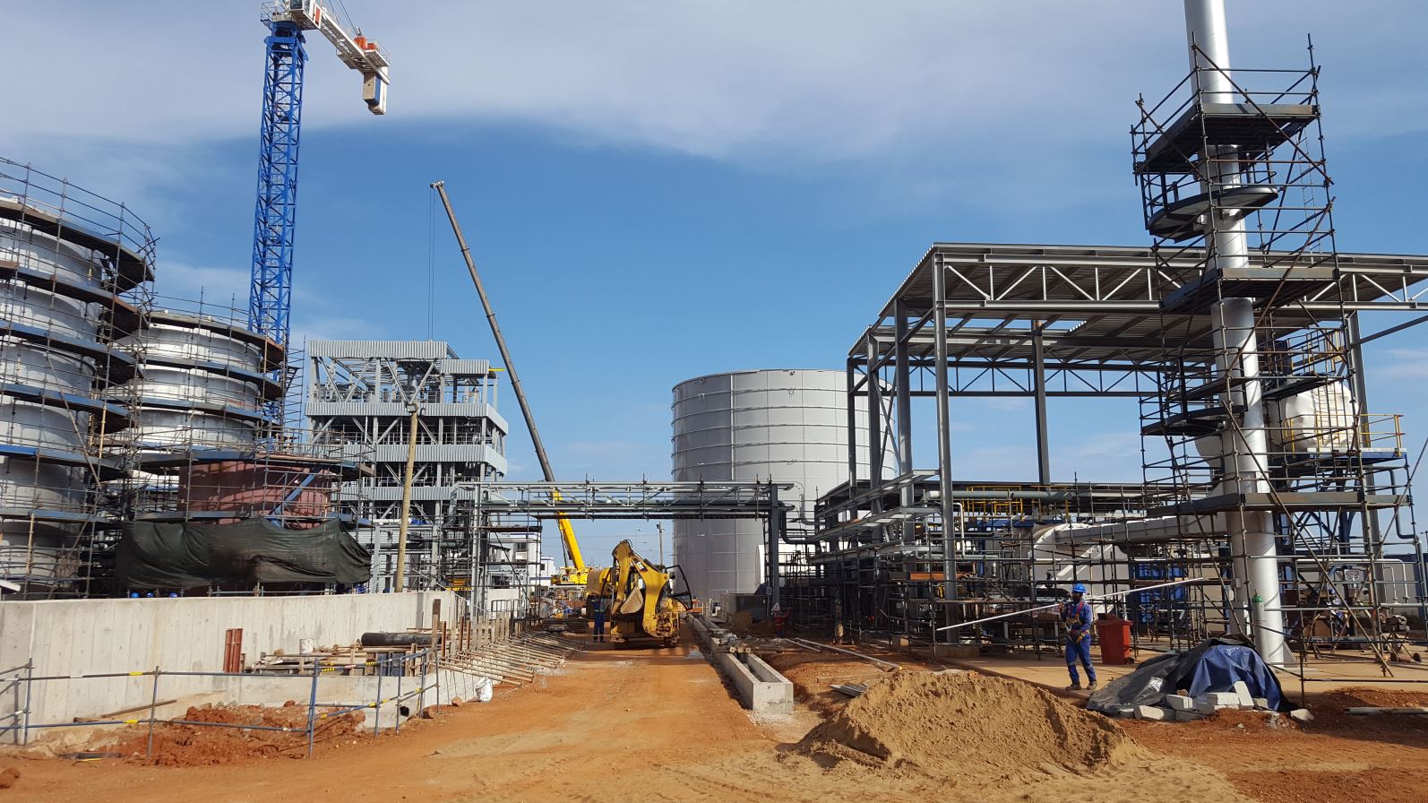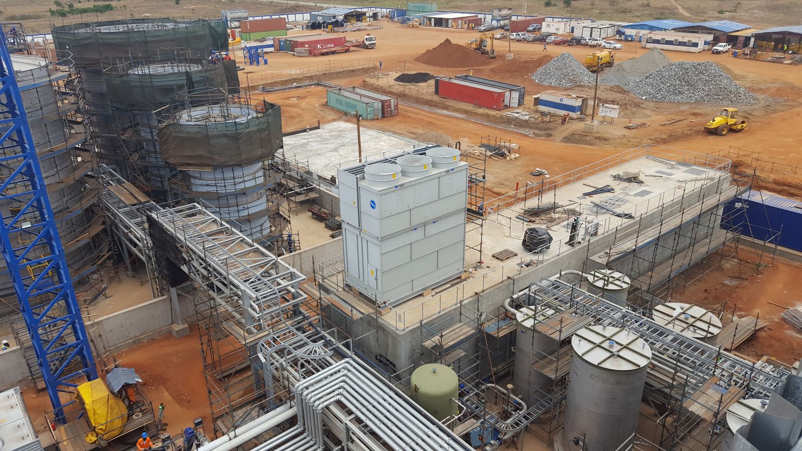 Detail engineering en on-site levering van de staalconstructie en dak en gevelbeplating voor de nieuwbouw van een palmolie fabriek in Ghana, Afrika. De staalconstructie is middels containers per boot naar Ghana getransporteerd.