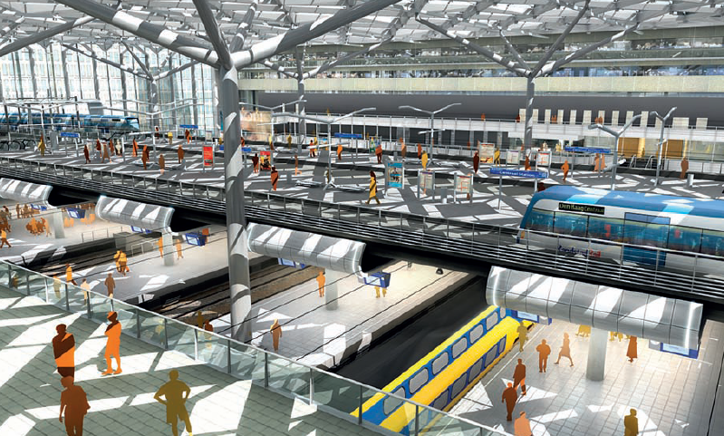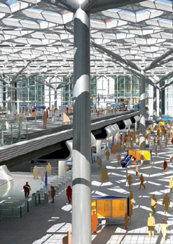 The new Public Transport Terminal (OVT) in The Hague is designed in a box shape, with glass façades and a glass roof (its "5th façade"). The Terminal has a very special show piece with its new roof. In order to achieve a transparent feeling, the roof and facades will be built up with numerous glass panels. Diagonal roof lines lead the travelers to the four new passage ways.