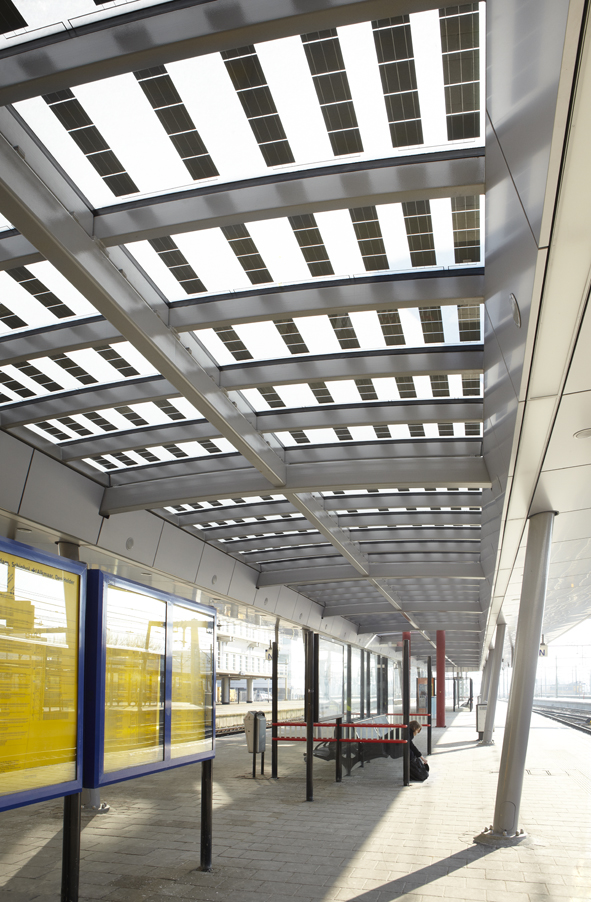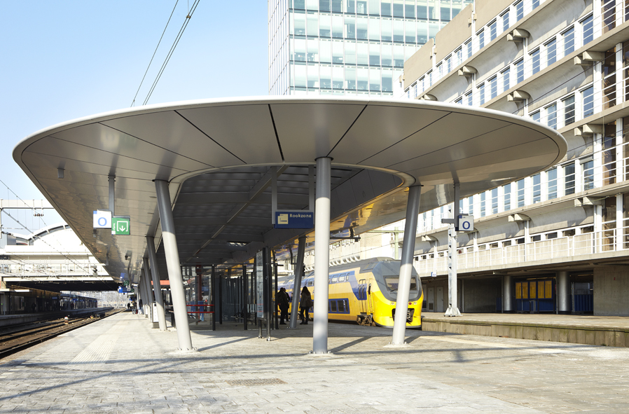 Levering en montage van de perronkappen, dakgoten voor hemelwaterafvoer en eveneens van de dakluiken en bevestigingsmateriaal voor de glazen panelen.